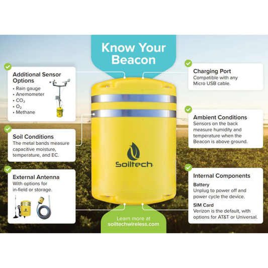 The Beacon sensor can be buried for below-ground data collection, added to a storage pile to track temperature and humidity, or placed in the canopy as a weather station. The Beacon collects real-time data and synchronizes it with the Signal platform for further analysis and decision-making.