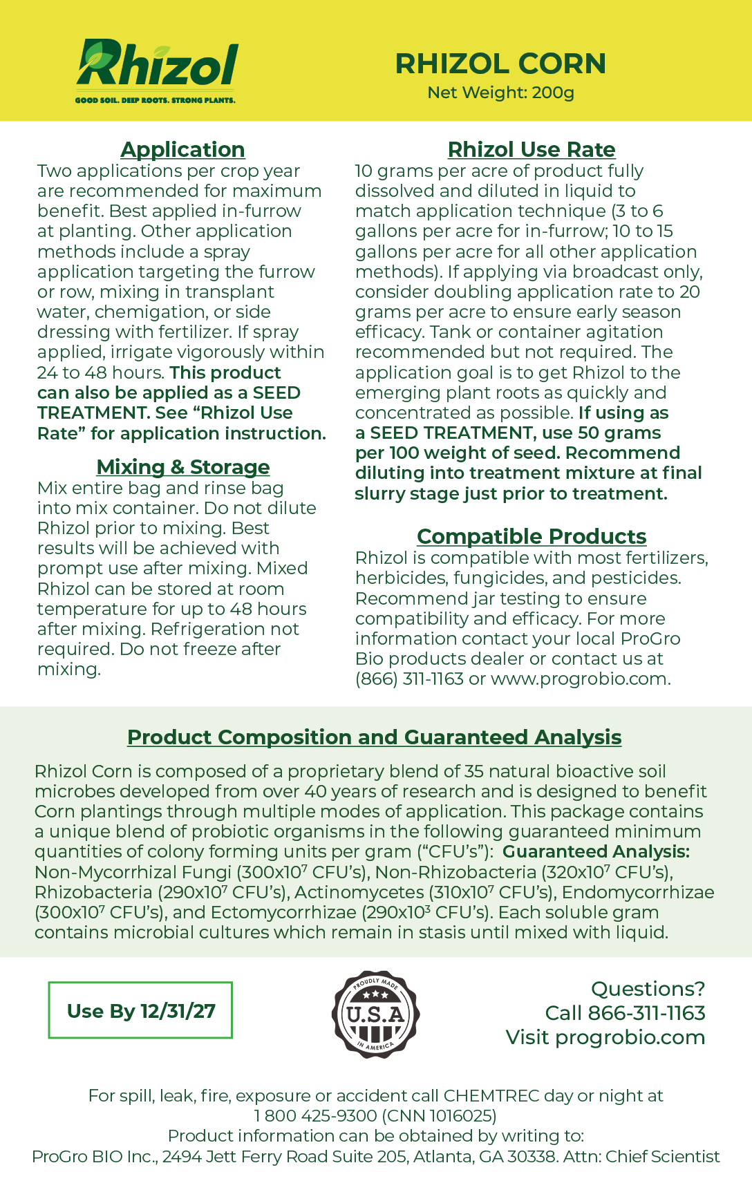 This Rhizol product is formulated for Corn and available in varying acreage sizes. Offered in packs for 20 and 40 acres. Check the Dissolvable Rhizol Soil Inoculant Instructions for application method, use rate, mixing and storage instructions, as well as product compatibility.