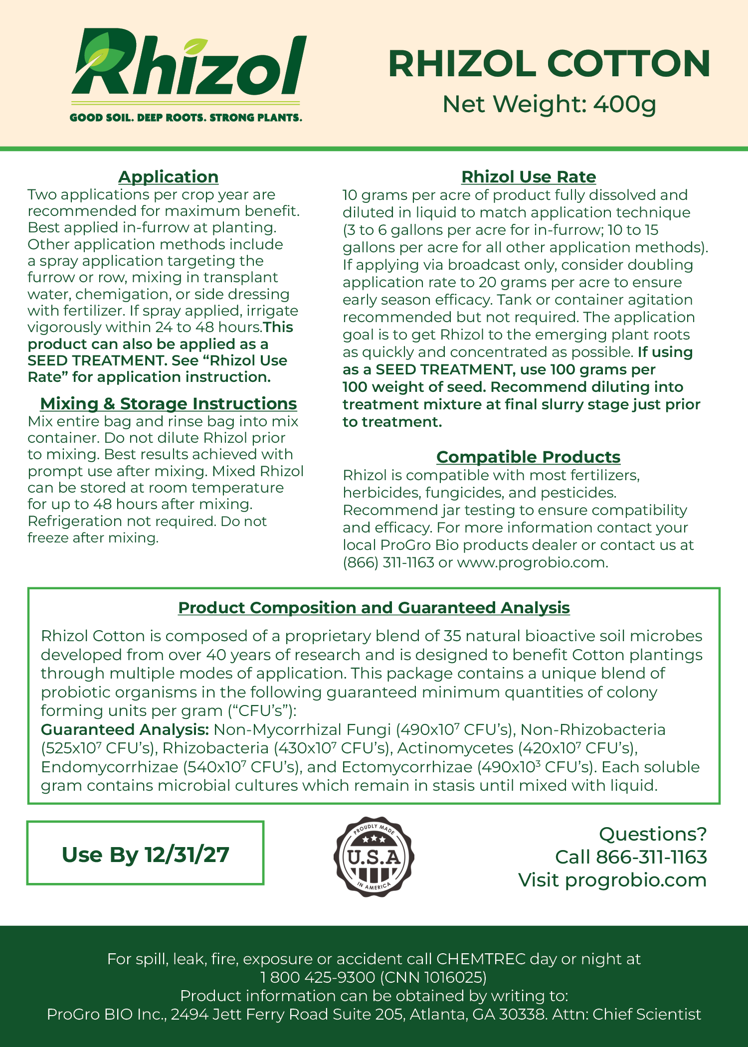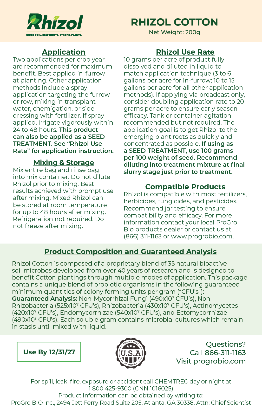 This Rhizol product is formulated for Cotton and available in varying acreage sizes. Offered in packs for 20 and 40 acres. Check the Dissolvable Rhizol Soil Inoculant Instructions for application method, use rate, mixing and storage instructions, as well as product compatibility.