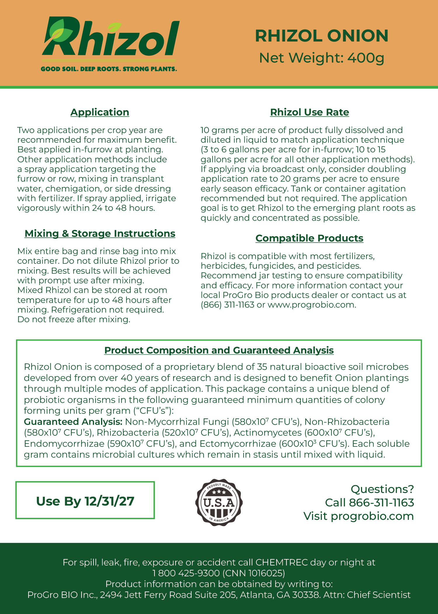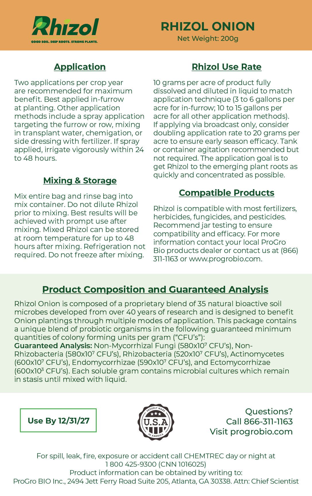 This Rhizol product is formulated for Onion and available in varying acreage sizes. Offered in packs for 20 and 40 acres. Check the Dissolvable Rhizol Soil Inoculant Instructions for application method, use rate, mixing and storage instructions, as well as product compatibility.