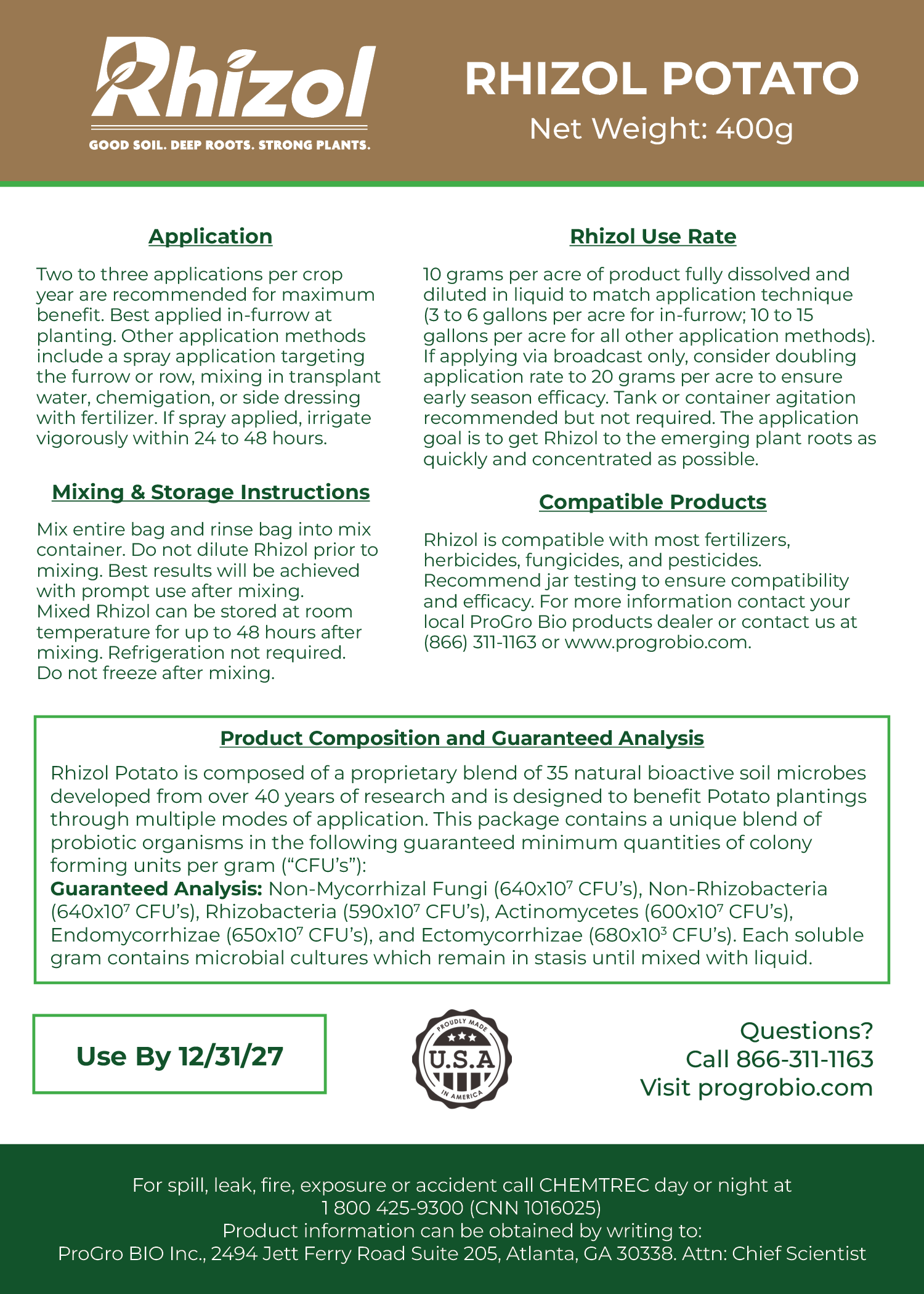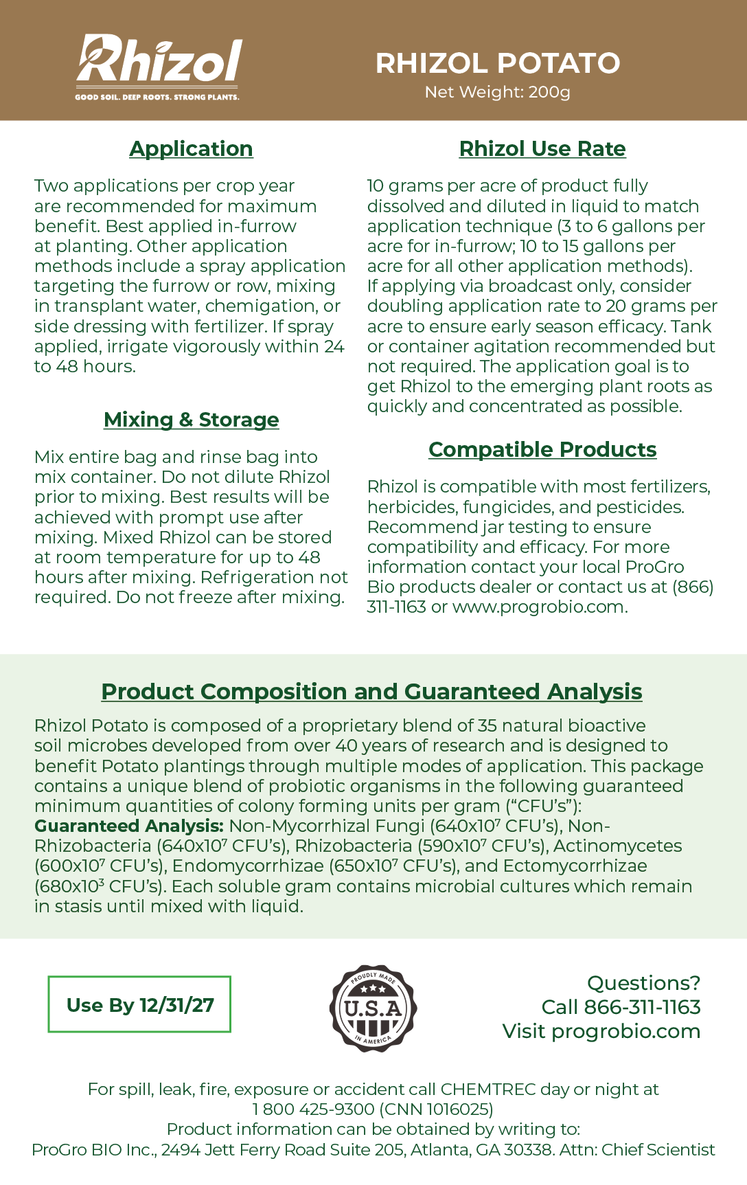 This Rhizol product is formulated for Potatoes and available in varying acreage sizes. Offered in packs for 20 and 40 acres. Check the Dissolvable Rhizol Soil Inoculant Instructions for application method, use rate, mixing and storage instructions, as well as product compatibility.