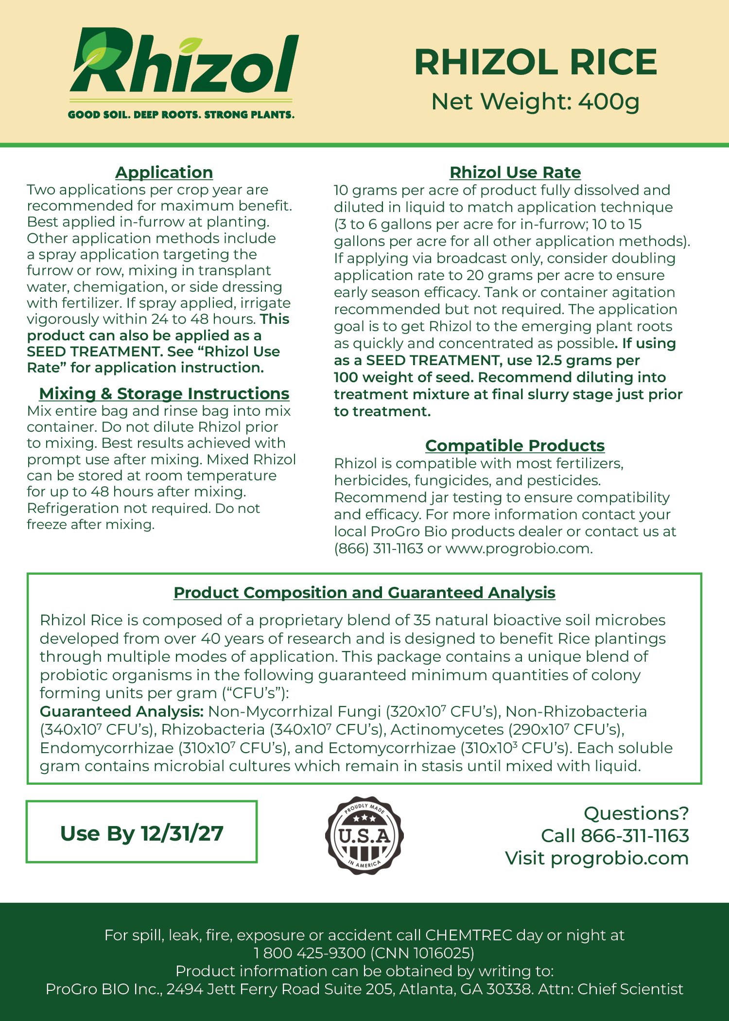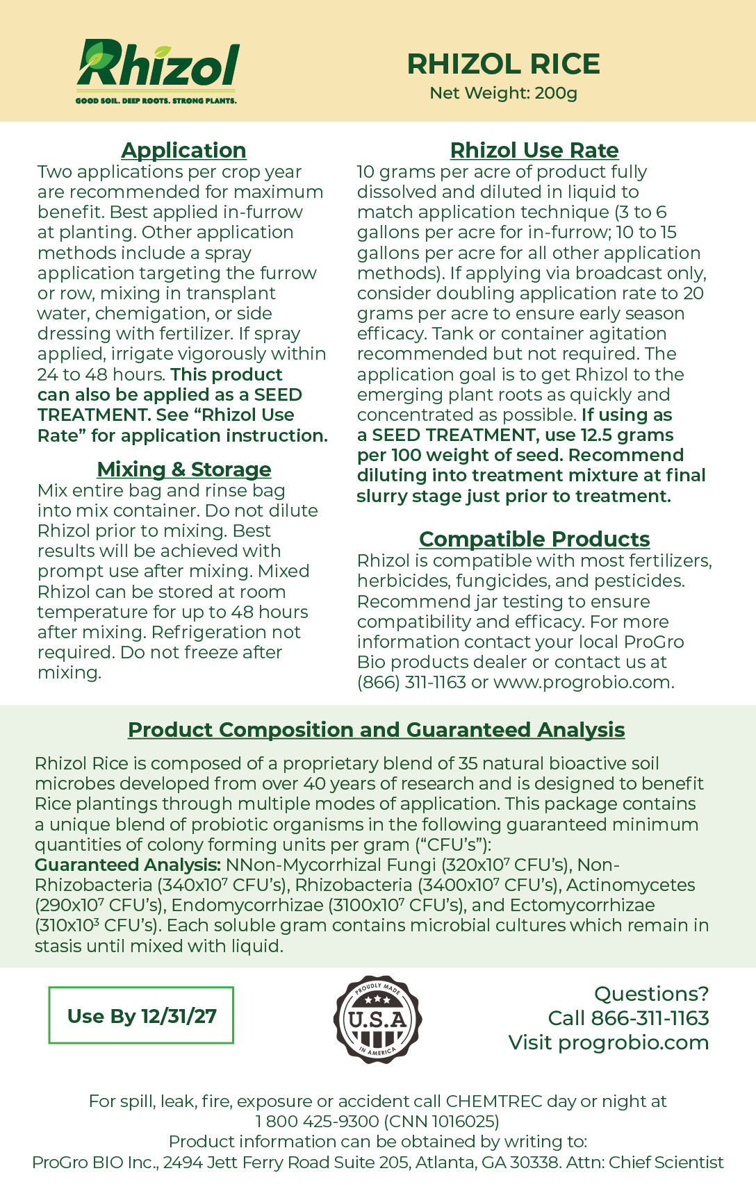 This Rhizol product is formulated for Rice and available in varying acreage sizes. Offered in packs for 20 and 40 acres. Check the Dissolvable Rhizol Soil Inoculant Instructions for application method, use rate, mixing and storage instructions, as well as product compatibility.
