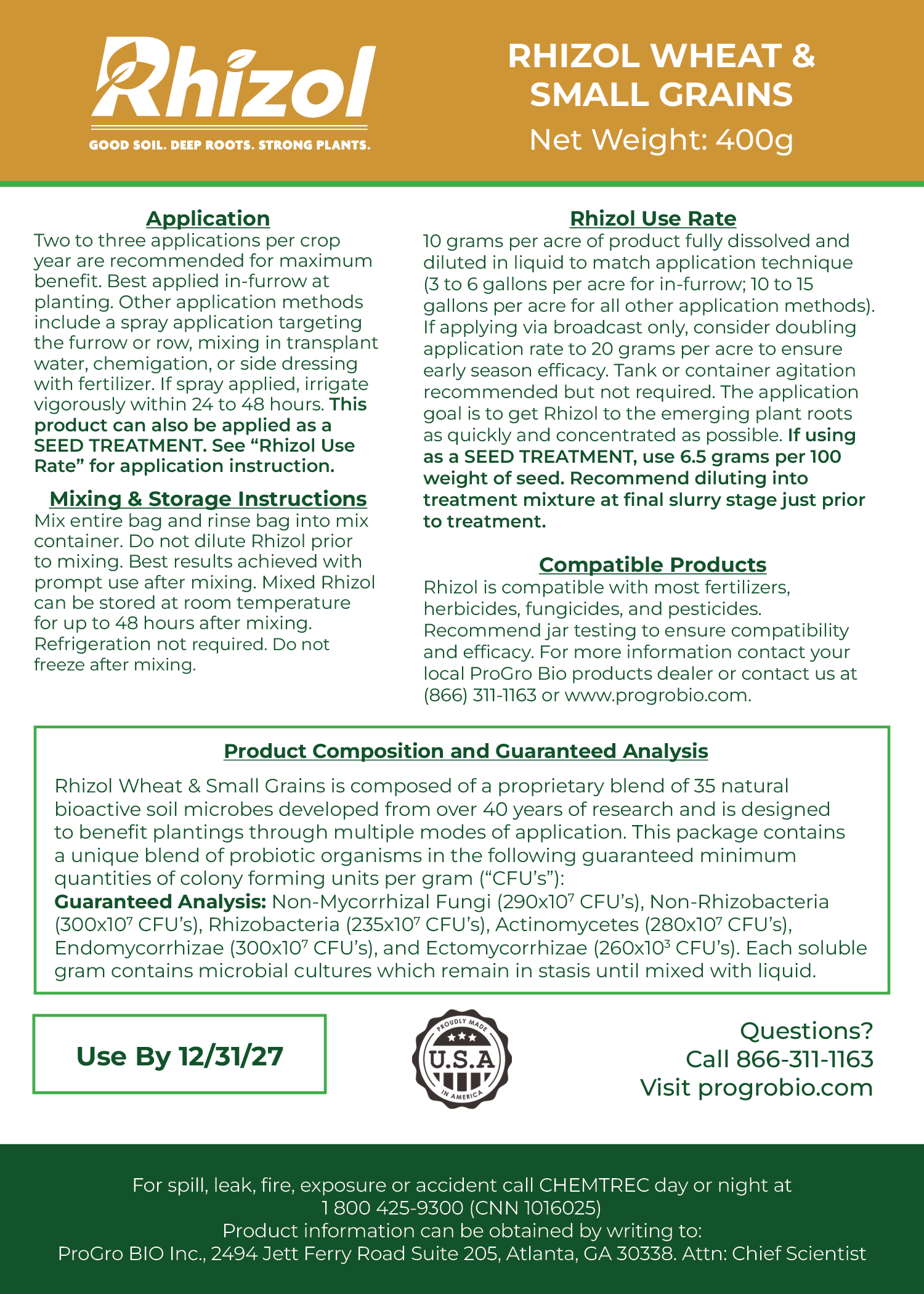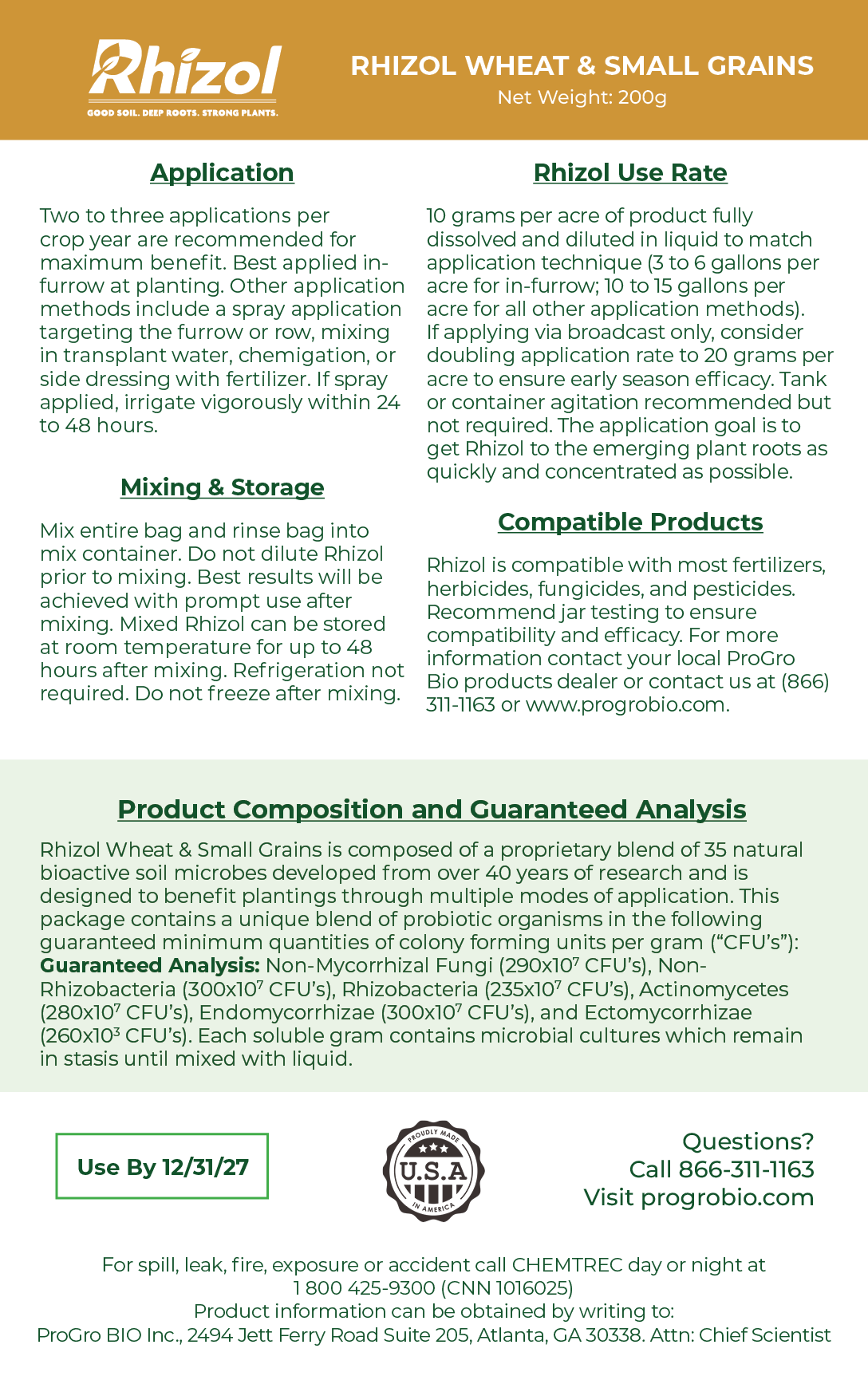 This Rhizol product is formulated for Wheat and available in varying acreage sizes. Offered in packs for 20 and 40 acres. Check the Dissolvable Rhizol Soil Inoculant Instructions for application method, use rate, mixing and storage instructions, as well as product compatibility.