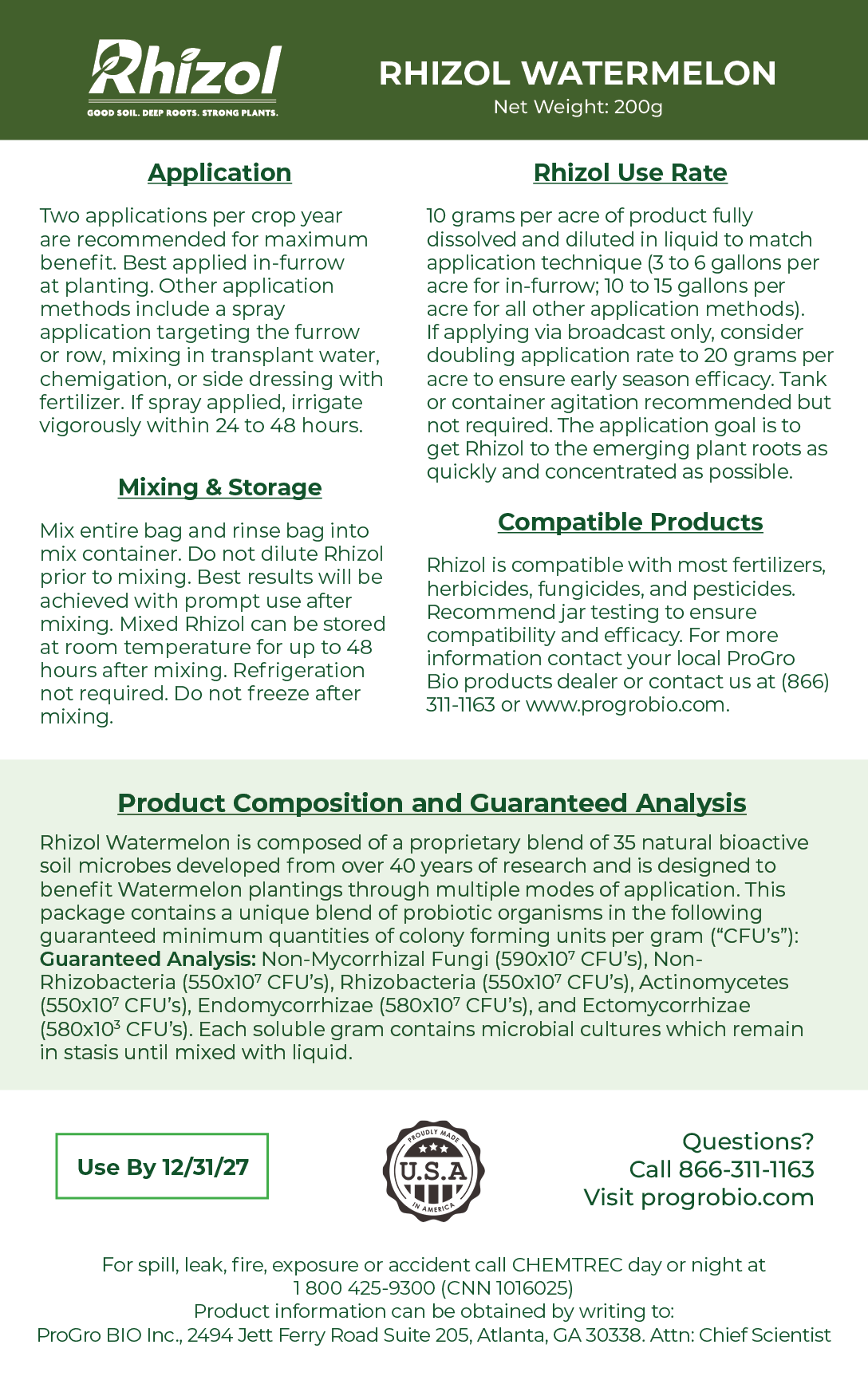 This Rhizol product is formulated for Watermelon and available in varying acreage sizes. Offered in packs for 20 and 40 acres. Check the Dissolvable Rhizol Soil Inoculant Instructions for application method, use rate, mixing and storage instructions, as well as product compatibility.